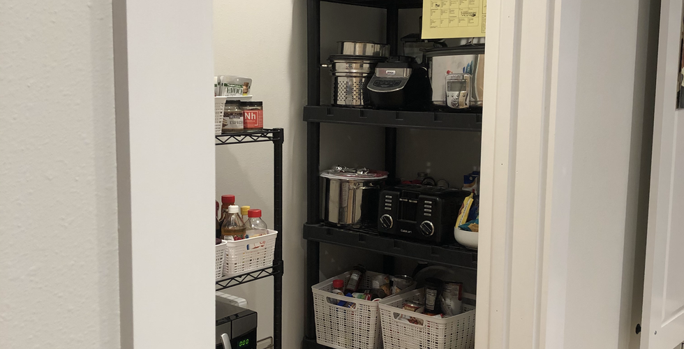 I had big plans for this space including a walk through to the dining room creating a butler pantry, tons of shelving, a butcher block counter for the microwave and other small appliances to be out and accessible, but as the build was wrapping up and we needed our certificate of occupancy (CO), that project was delayed. We put some temporary shelves up and while it wasn't the prettiest, it was a pretty functional space. I like to be able to see everything so our large pantry held all the dry goods, and most of small appliances (toaster, crock pot, mixer attachments, microwave, spiralizer). There was a small space created behind the fridge (we stole space so that it would look counter depth, but have a flush built in look) that was perfect for the vacuum, mop & bucket, broom. All our other cleaning supplies fit nicely under the sink.